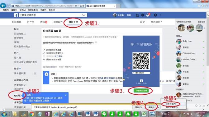 1.臉書管理員-->進入臉書-->發佈工具-->QR碼-->下載所有海報->另存新檔(加公司名 例如:三義慢城樂活趣)